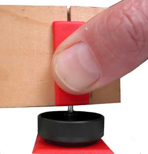 8. Place the end of the axle 1/8" into the slot between the toothpick and axle installer. Press your thumb on the axle installer while inserting the axle to force the axle snug against the toothpick. The axle installer will raise up slightly. If you do not have an axle installer, push the axle straight into the slot just above the toothpick.